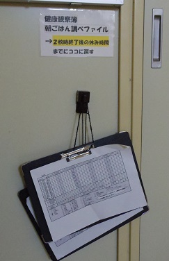 本校おなじみの「紅茶うがい」用ポット。あわせて健康観察簿も保健・給食常任委員会グッズです。朝、職員室前の机に用意されています。