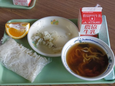 わかめうどん、じゃがいもとベーコンの粉ふきいも、オレンジ、牛乳でした。