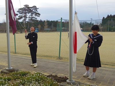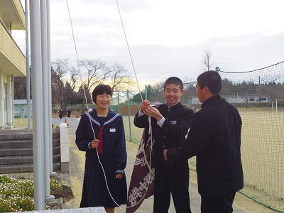 まず朝一番に、国旗と市旗と校旗を掲揚することから活動が始まります。