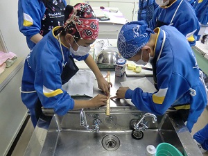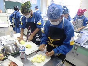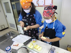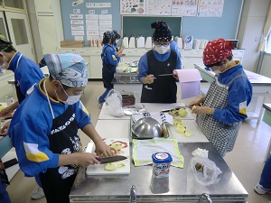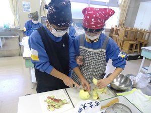 包丁を上手に使い、りんごの皮むきを行い、最後は他のフルーツと一緒にフルーツサラダにしました。また、自分がむいたりんごの皮の長さを測り、廃棄率の計算も行いました!