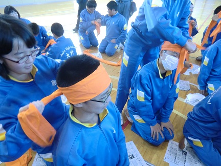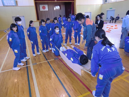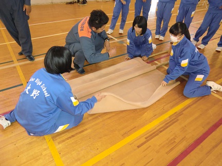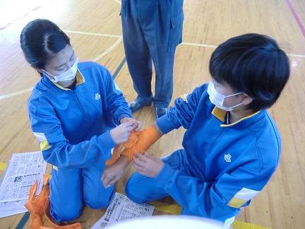 5・6校時に防災教室を行いました。5校時は、消防士7名の方に来ていただき、災害時に必要な応急処置の仕方を教えていただきました。頭をけがしたときの止血法、骨折したときに身近な物(今回は雑誌)で固定する方法、担架がないときに棒と毛布で即席担架を作る方法など、友達同士で実習しました。