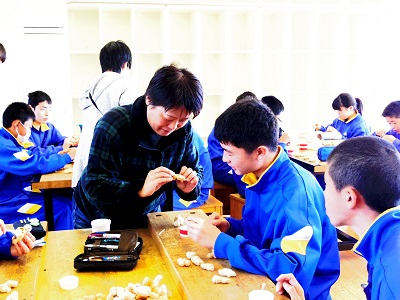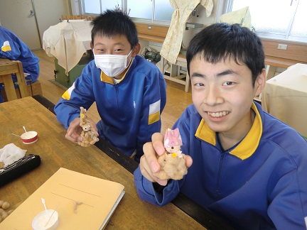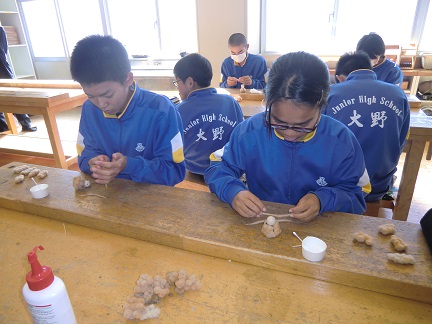 2年生の技術では授業でオーガニックコットンを栽培しました。栽培からお世話になったNPO法人の方が来校してくださいました。今日は教えていただきながら、自分たちで栽培したコットンを使って「コットンベイブ」を作りました。