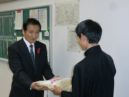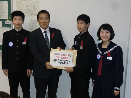 本日、校長室で「赤い羽根共同募金」の贈呈式が行われました。環境・JRC常任委員会の役員3名が、生徒のみなさんからの募金を四倉地区行政嘱託員協議会の公平和俊会長にお渡ししました。