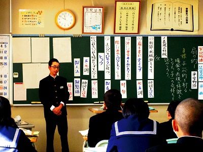 2年生の国語では「平家物語」を学習します。那須与一が海に浮かぶ舟の上の扇の的を弓矢でいる場面を古文で読み、今日は与一の気持ちを読み取りました。