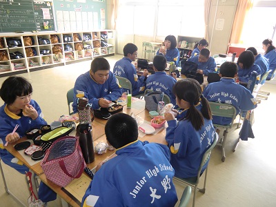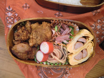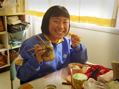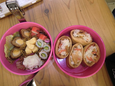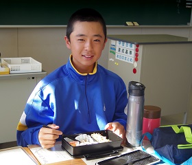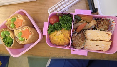 メニューを考えたり、お弁当箱に詰めたり、もちろん自分で作ったり。学級で聞いたところ、一品以上を自分で作ったと答えた生徒が大勢いました。中には、全部作ったという1年生もいました。おむすびあり、サンドイッチあり、いなり寿司あり。流行をいくジャーご飯もありました。形態も中身もバラエティに富み、おうちの人の愛情を感じるお弁当ばかりでした。