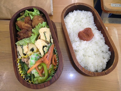 は、全員が何かしら準備に関わったお弁当を持ってきました。「メニューを決める」「材料を買う」から「お弁当箱を洗う」「後片付け」まで、チャレンジ項目20個の中から3個以上に取り組むことを目標に、お弁当作りにチャレンジしました。