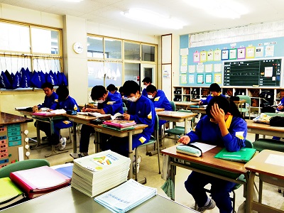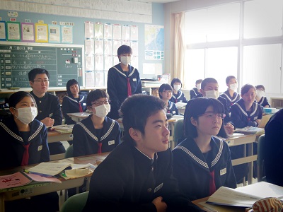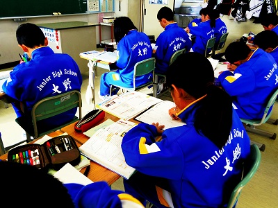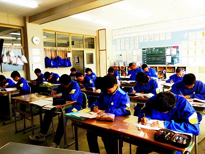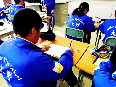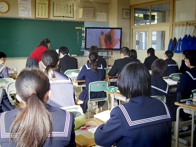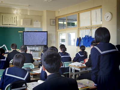 3年生の国語の授業では、2つの新聞の社説を読み比べ、短い意見文を書きました。テレビ画面を利用して、友達の意見文を全員で読み、より良い意見文とするためのポイントを確認しました。与えられた字数の中で、自分の意見を効果的に述べるポイントを学習しました。生徒たちは真剣な表情で友達の意見文を読み、先生の説明に聞き入っていました。