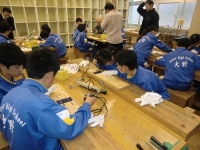 去る、11月29日(土)の8:30~13:00に、大野中でNPO法人インディアンビレッジキャンプ(代表:島村さん・ほか2名)によるクリーンエネルギー体験教室(ソーラーパネル<太陽電池>作り)が元区長さん立合いのもと開かれました。体験には、生徒17名と保護者2名が参加しました。