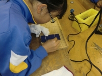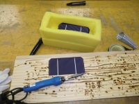 前半は、はじめに島村さんから太陽電池についての説明があり、その後、はんだごてを使って電池作りに励みました。後半は、みんなで作成した電池をつなぎ合わせて大きなパネルにしました。最後に、実際に光を当てて発電した電気でLEDライトをつけることができ感動していたようです。