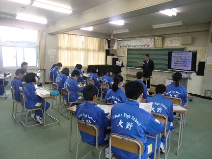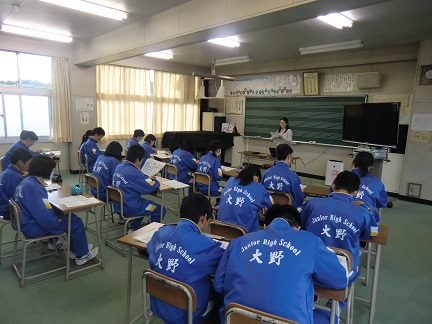 今回の授業は、本校の現職教育の一貫の1つで1学期から2学期末にかけて各教科または一人一授業提供で教師全体で研究会を開いています。大野中学校の現職テーマ「 生徒一人一人が自ら考え理解し、表現する学習指導の工夫 」のもと、平成26年度副主題「 生徒が自ら考え理解するための個に応じた支援の工夫 」に迫れるように学級活動の授業がT・T方式(T3)で行われました。