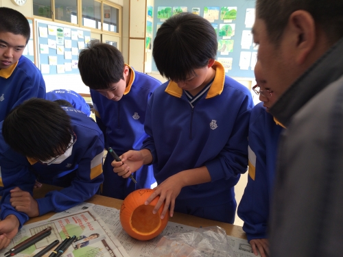 今日(28日)、英語科の授業で、ALTの先生からハロウィンについてのお話を聞き、jack-o'-lantern(ジャック・オー・ランタン)作りに挑戦しました。