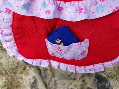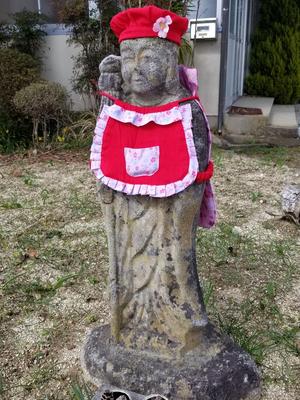 お地蔵様(じぞうさま)の新(あたら)しいお着物(きもの)です。頭巾(ずきん)に桜(さくら)の花がついていて、かわいらしいですね。学校評議員(がっこうひょうぎいん)の佐藤(さとう)さんが作(つく)ってくださいました。
