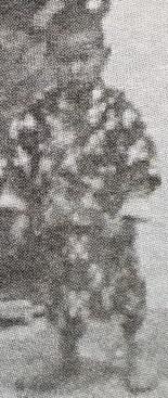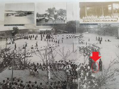 ここにいました!見つけることができましたか。昭和(しょうわ)15年ごろの写真(しゃしん)です。よく見ると、正門(せいもん)の柱(はしら)は今(いま)と同(おな)じですね。プールはまだありませんでした。すもうやけんどう、ダンスなどしていますね。まだ、学校(がっこう)に通(かよ)っていない小さな子も、見学(けんがく)しています。学校は、地域(ちいき)の人たちにとっても、楽(たの)しみな所(ところ)だったことがわかります。