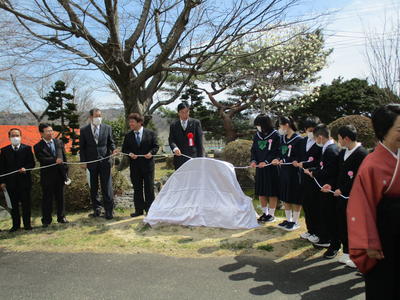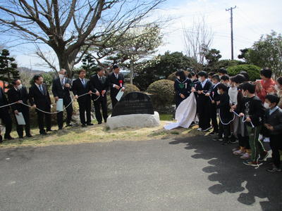 子どもたち、教育長様、閉校事業実行委員会の皆様、歴代PTA会長の皆様、職員、全員で除幕しました。無事にお披露目ができました。