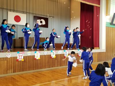 いよいよ豆がまかれます!年男・年女のいる5年生が担当です。