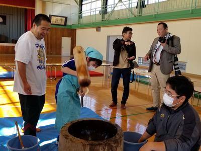 学習田で5年生が作ったもち米を使って、餅をつきました。