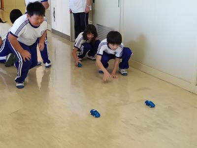手回し充電器を使って、ミニカーに電気を貯めます。