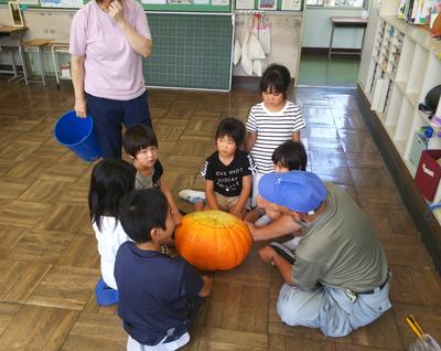 2019年9月6日 13時38分保護者の方からいただいた大きな飾りカボチャを、1・2年生がジャックオランタンに変身させるとのことで、くりぬき作業が始まりました。きっと中にはカボチャ太郎が入っているっ!と何度校長が言っても、無視するよい子たちでした。
