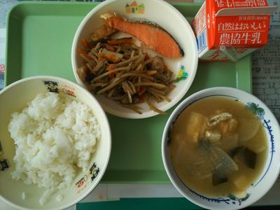 2019年9月10日 11時39分和食の日とは、「いいにほんしょく」の語呂合わせで11月24日です。今日はそれにちなんだのか、五目きんぴら、サケの塩焼き、大根の味噌汁、です。塩鮭は冬の間漁に出られなかったり、流通が滞って魚が食べられない地方での冬の保存食です。校長の生まれた山奥の里では身欠きニシンとともに重宝されてきました。大人になってからしょっぱくないサケを食べたときの衝撃を覚えています。こんなに甘いんだ、こんなに脂がのってるんだ・・。30年以上前の、いわき市小名浜での体験です。