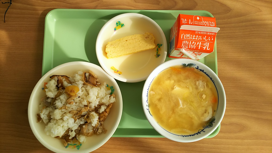 2018年10月25日 12時52分厚焼き卵にご汁。栗の季節ですね。ご飯に混ぜ込んで、おいしくいただきました。子どもたちも大好物です。