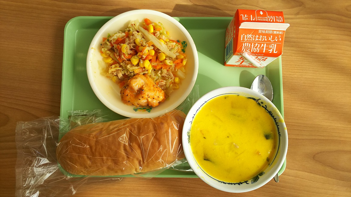 2018年10月26日 11時46分減量パンにリンゴジャム、鶏肉のガーリック焼き、キャベツとコーンのソテー、カボチャのポタージュです。ハロウィンは10月31日ですが、一足早く、収穫の秋を楽しんでください。