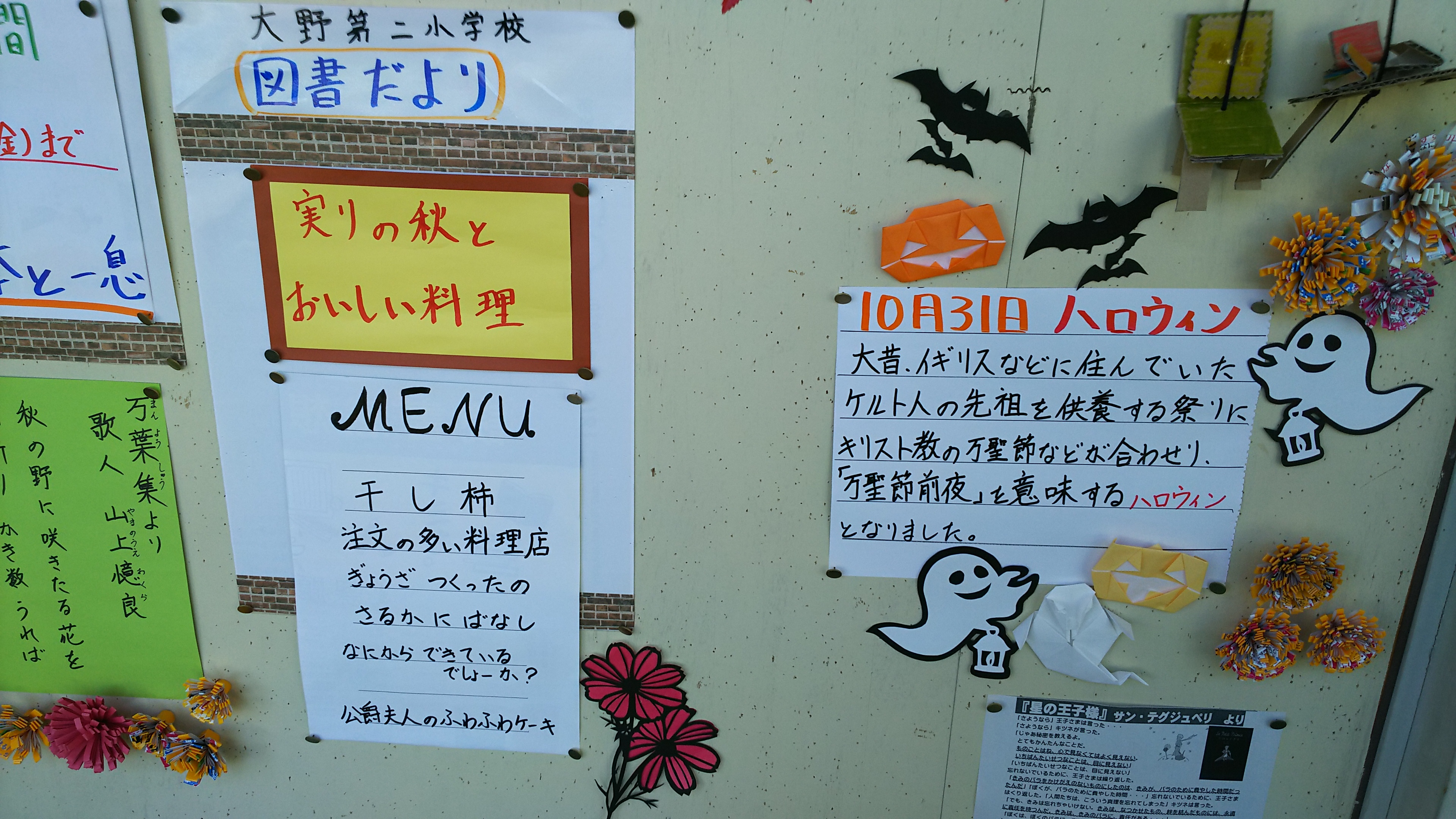 2018年10月29日 12時12分図書室には新しい掲示物が。いつもすてきなのですが、今回は学校に干してある干し柿がヒントの掲示らしいです。