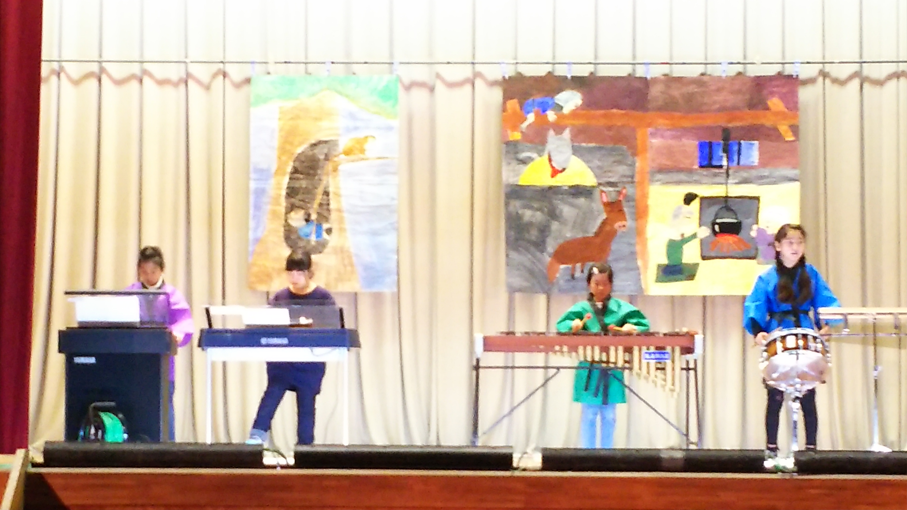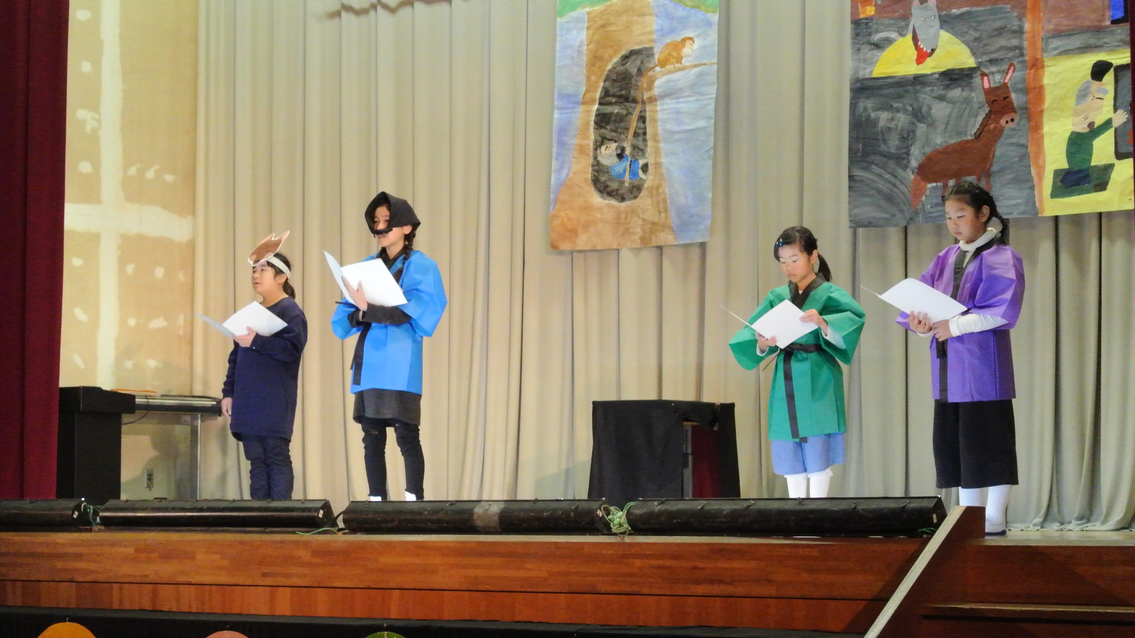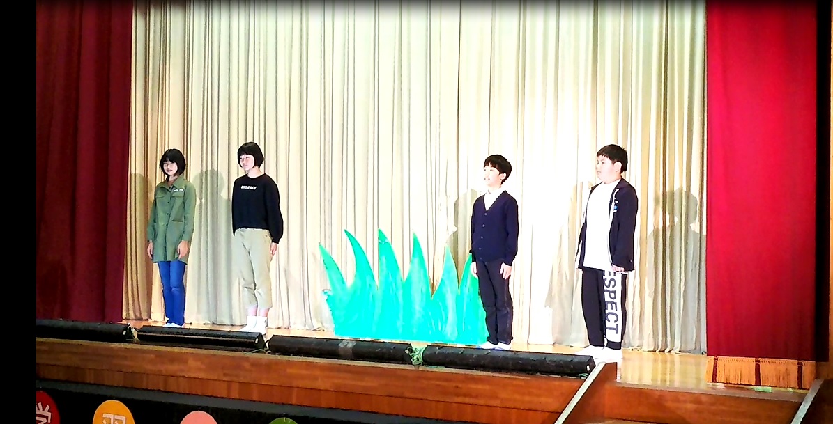 大勢の観客の皆さんを前にして、ちょっぴり緊張気味でした。続いて4年生による朗読劇と合唱・合奏の二本立て。