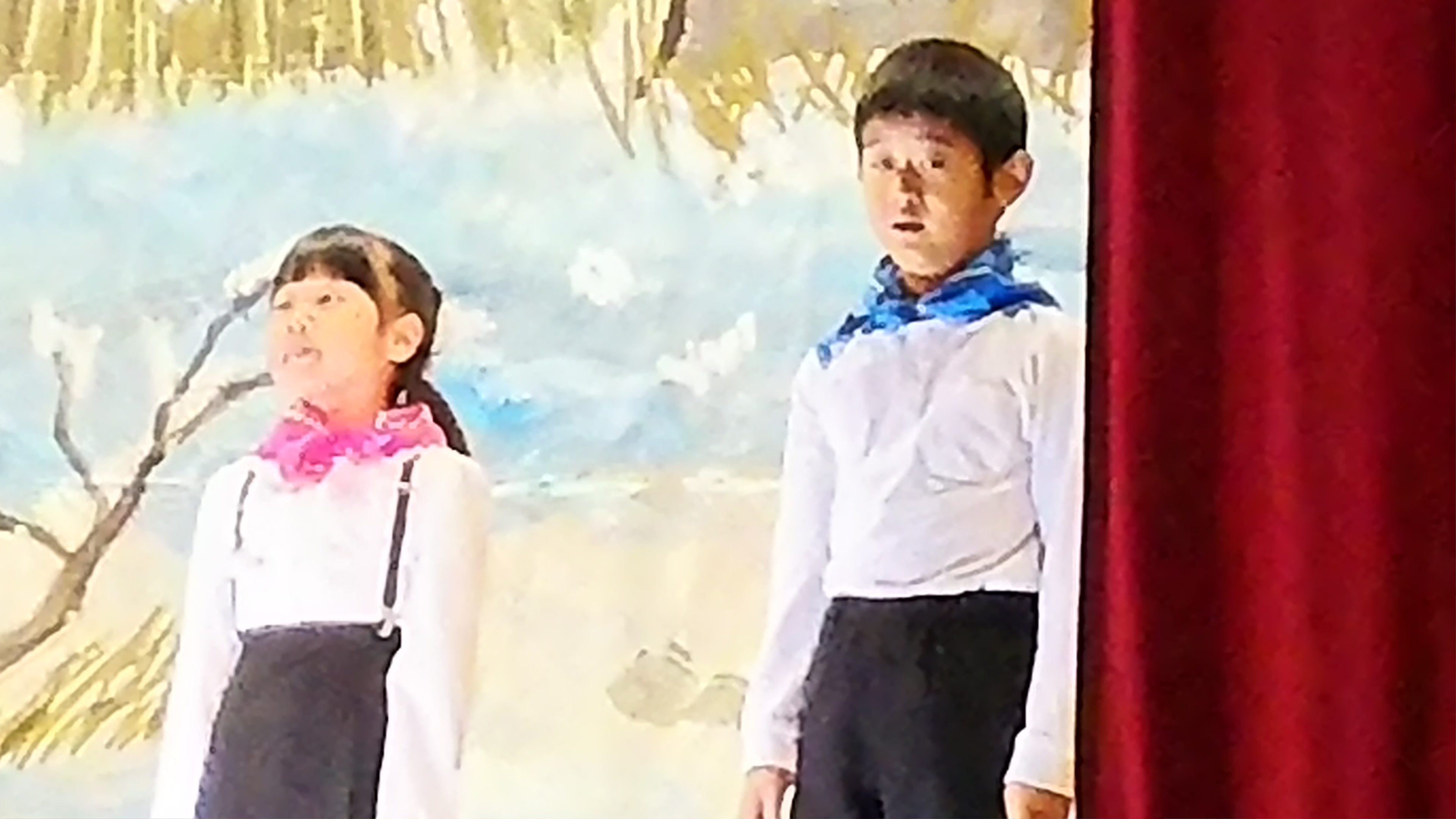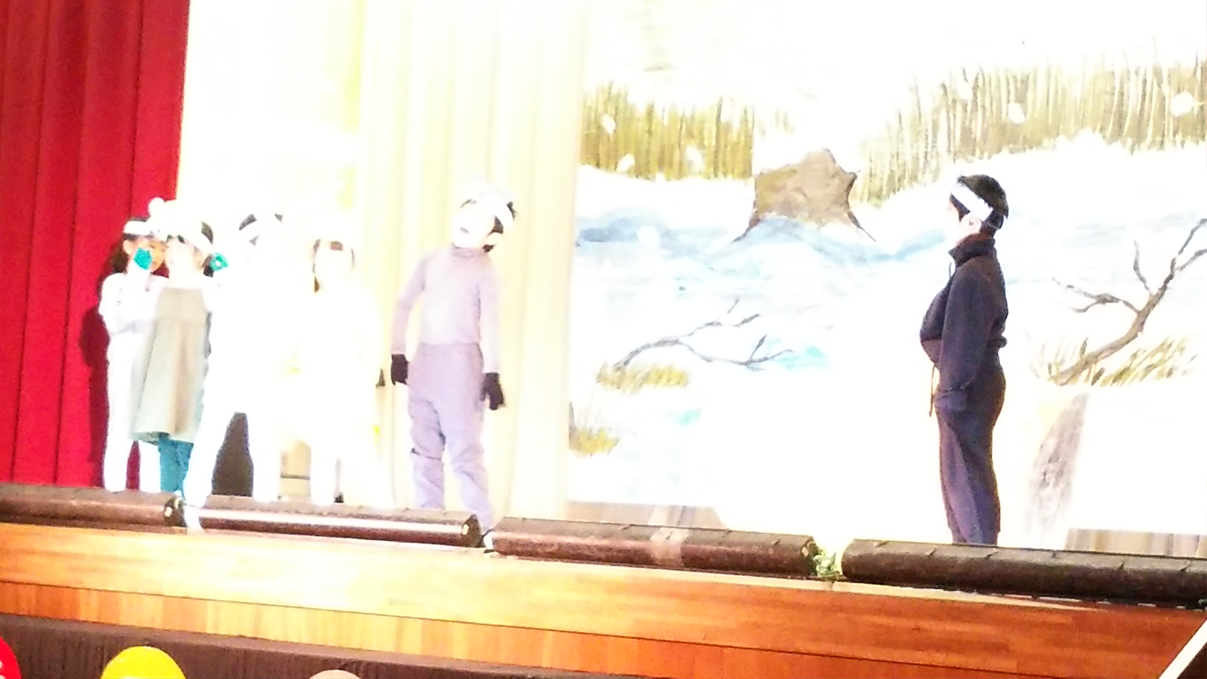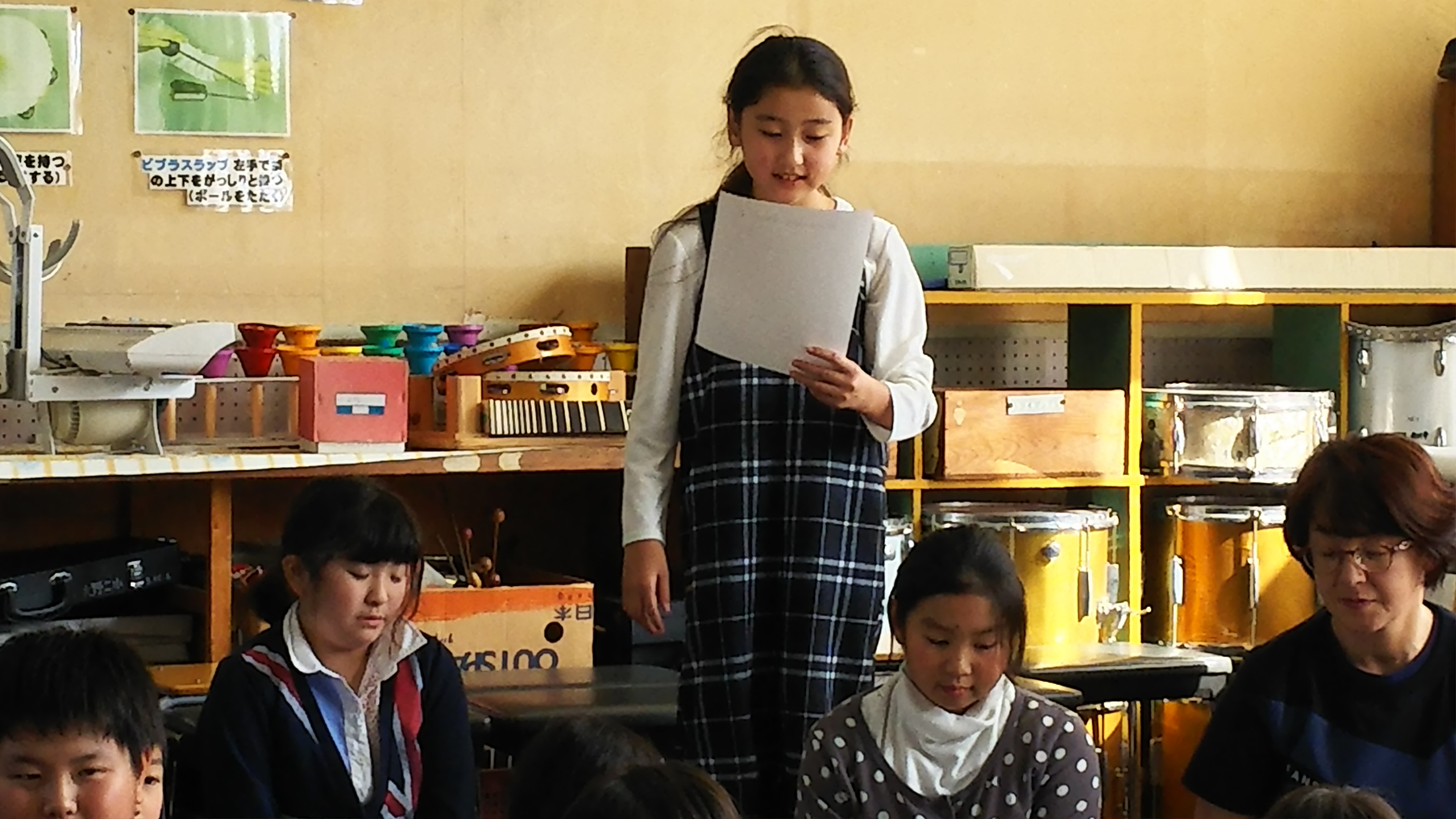 大勢の観客の皆さんを前にして、ちょっぴり緊張気味でした。続いて4年生による朗読劇と合唱・合奏の二本立て。