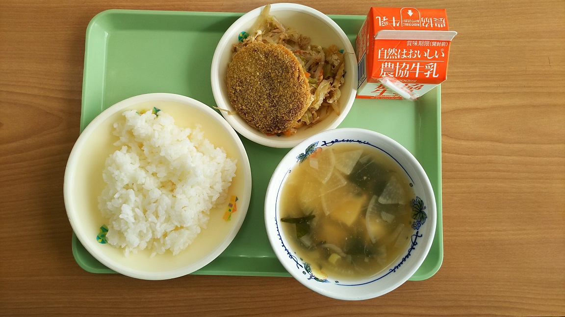 今日の給食はカレーメンチカツ、キャベツとツナのにびだし、鶏肉と大根のとろみスープです。スープのとろとろがおいしい季節ですね。おや、1・2年生の教室から元気よく「はいっ」と聞こえてきました。そろそろ本領発揮かな?