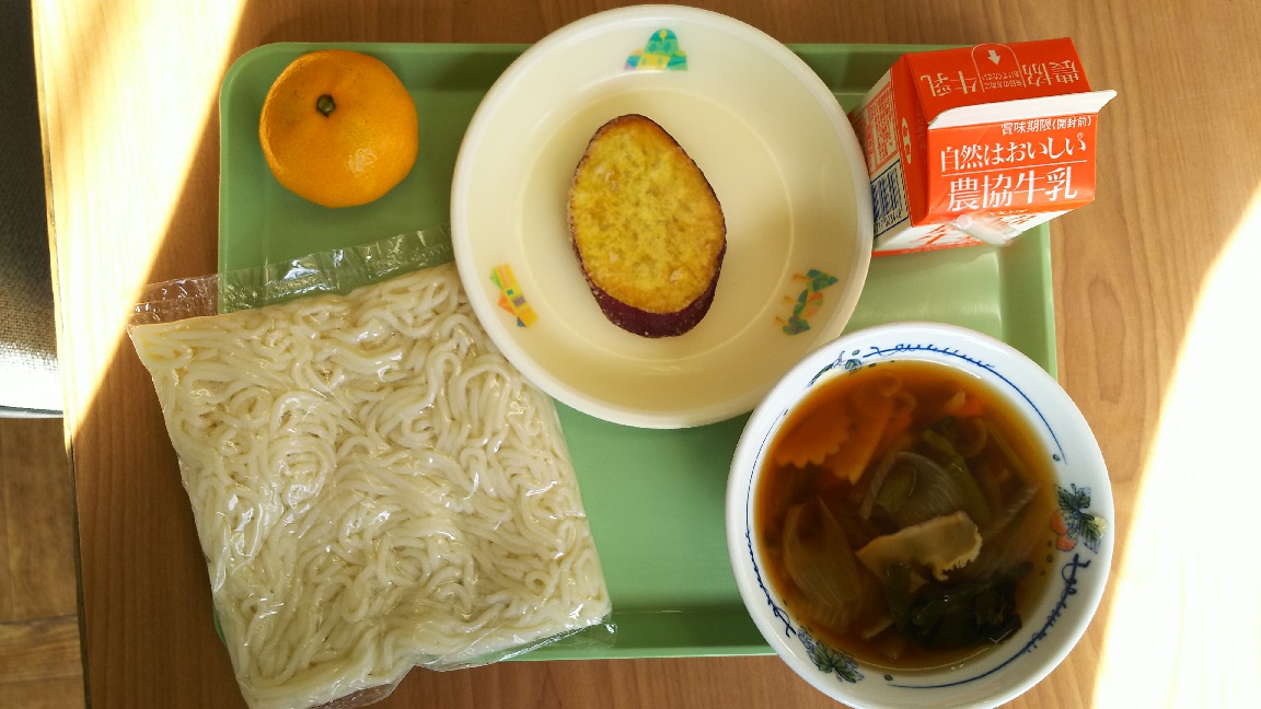 2018年10月24日 11時59分サツマイモの天ぷらとミカン付きです。子どもたちがソフト麺を器用に6等分して少しずつつけ麺のように汁に入れることは以前ご紹介しました。でも、6年生ともなると、いっぺんに入れて豪快にすするのかなぁと思ったら、やっぱり少しずつおちょぼ口で食べている、お上品さがすてきでした。