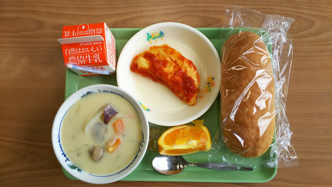 2018年10月12日 12時36分減量コッペパン、サツマイモのシチュー、トマトソースのオムレツにオレンジ付き。ジャムはいわきの梨で作りました。いわきの梨って、あまくて、ジューシーで、とってもおいしいですよね。たくさん食べて、学習発表会の時に元気よく歌えるようにしてください。