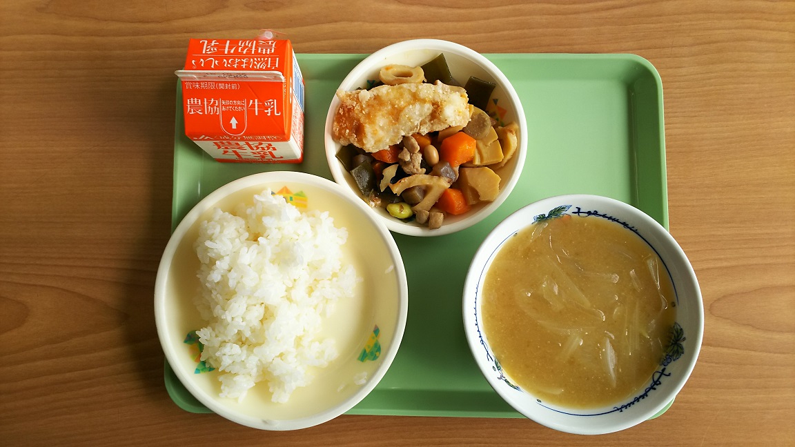 2018年10月15日 11時50分ナメコとじゃがいもの味噌汁、五目豆です。豆が給食にはよく出ます。育ち盛りの子どもたちにはタンパク質をたくさんとってほしいです。