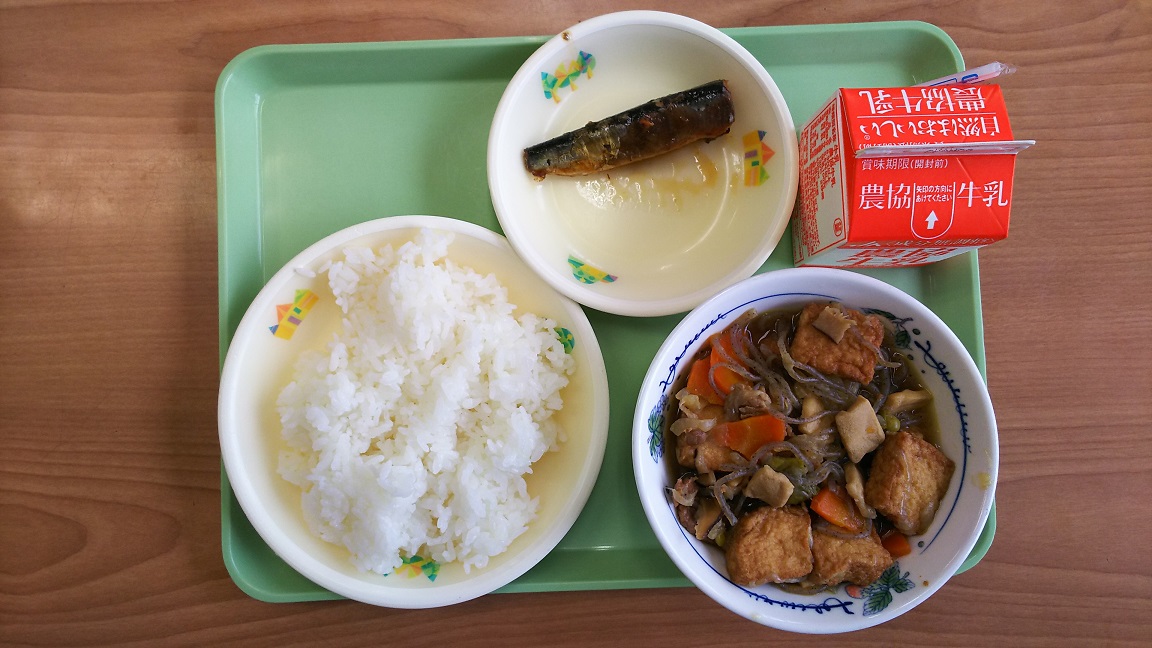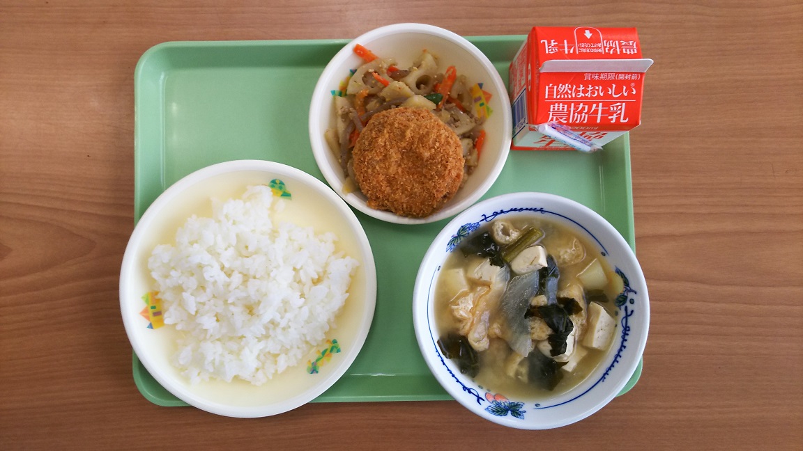 2018年10月9日 12時08分レンコンの味噌いためは、ちょっと辛口。1年生は大丈夫かな?キャベツメンチカツとほうれん草の味噌汁です。野菜たっぷりメニーです。