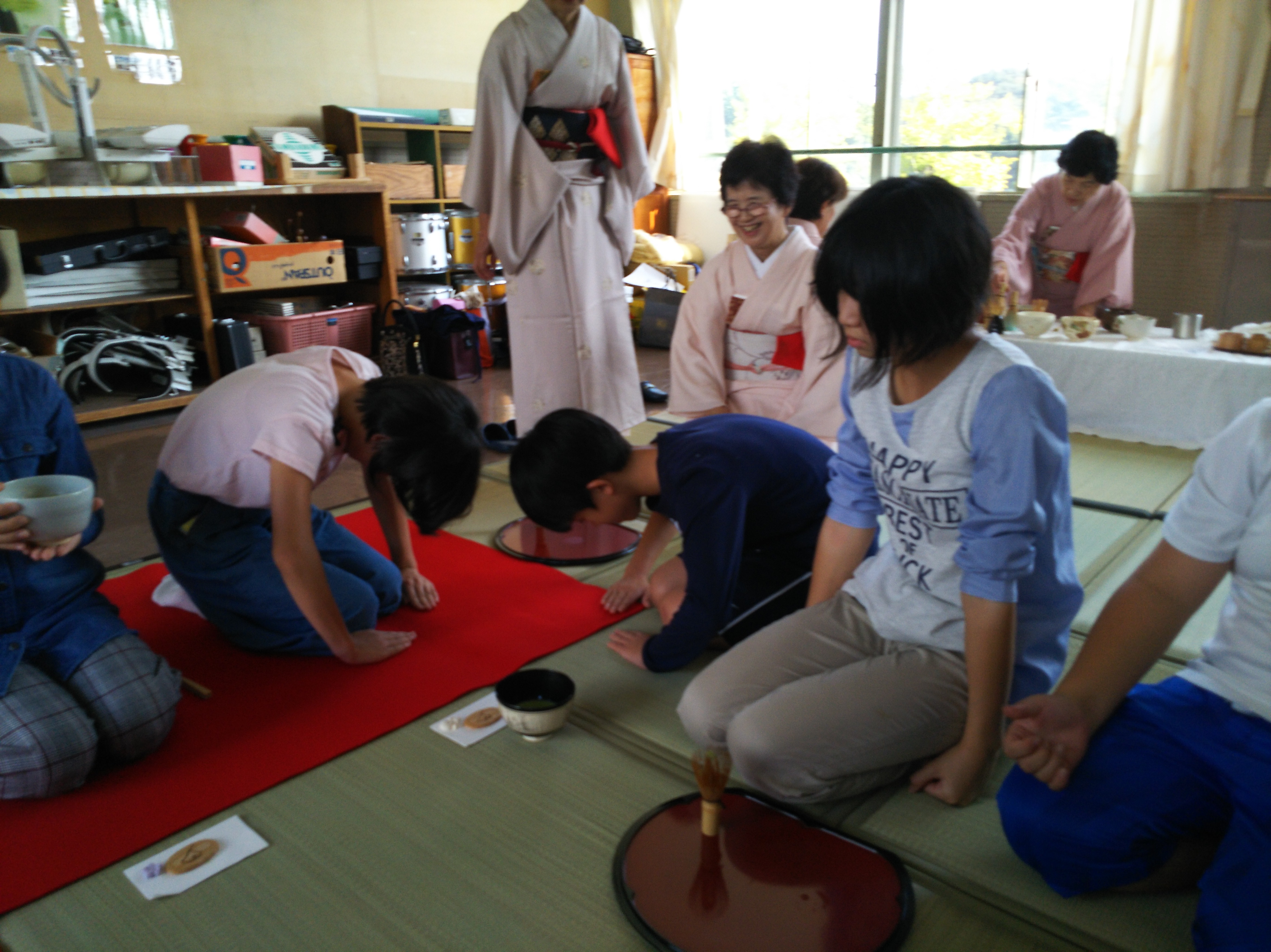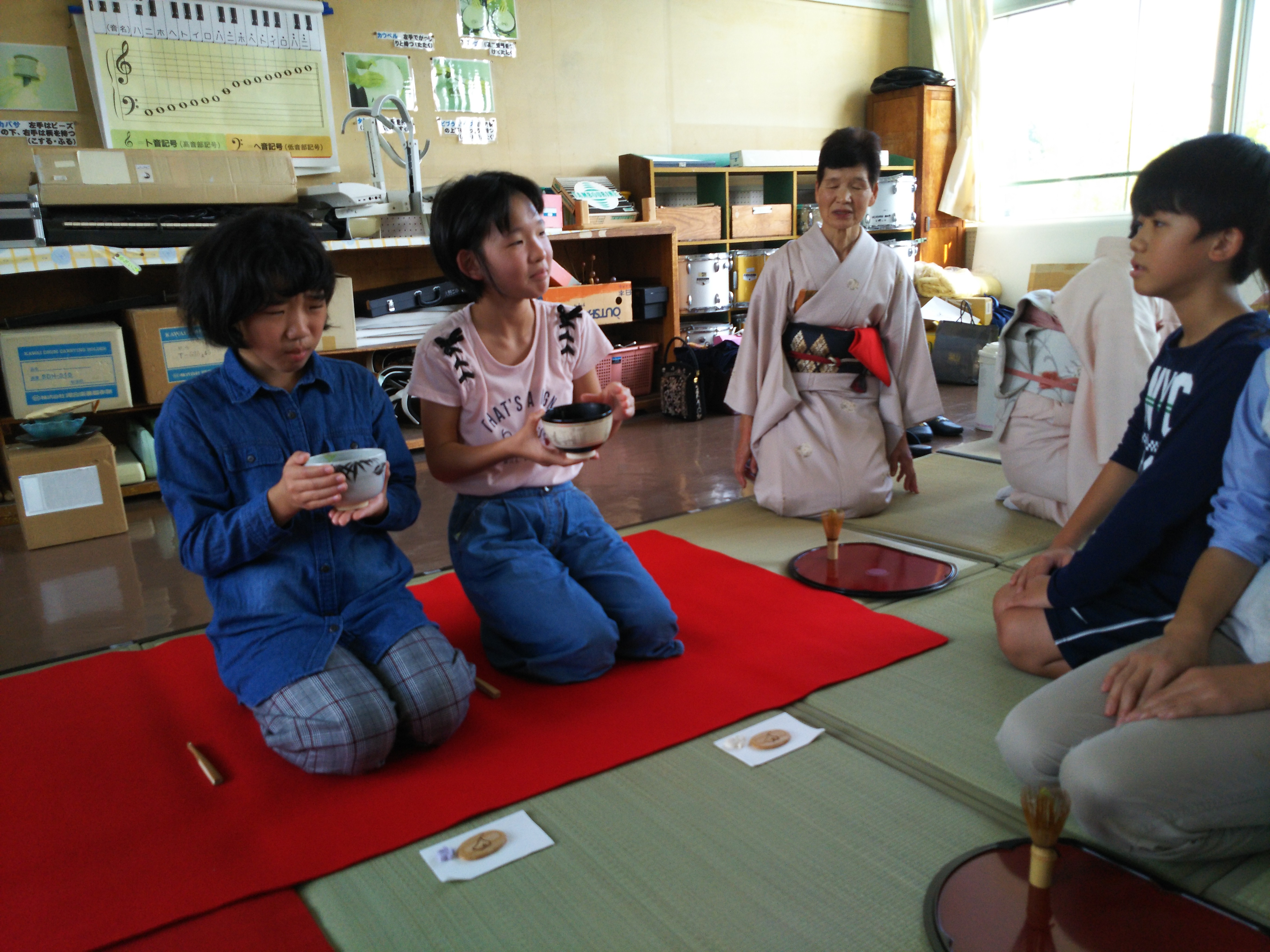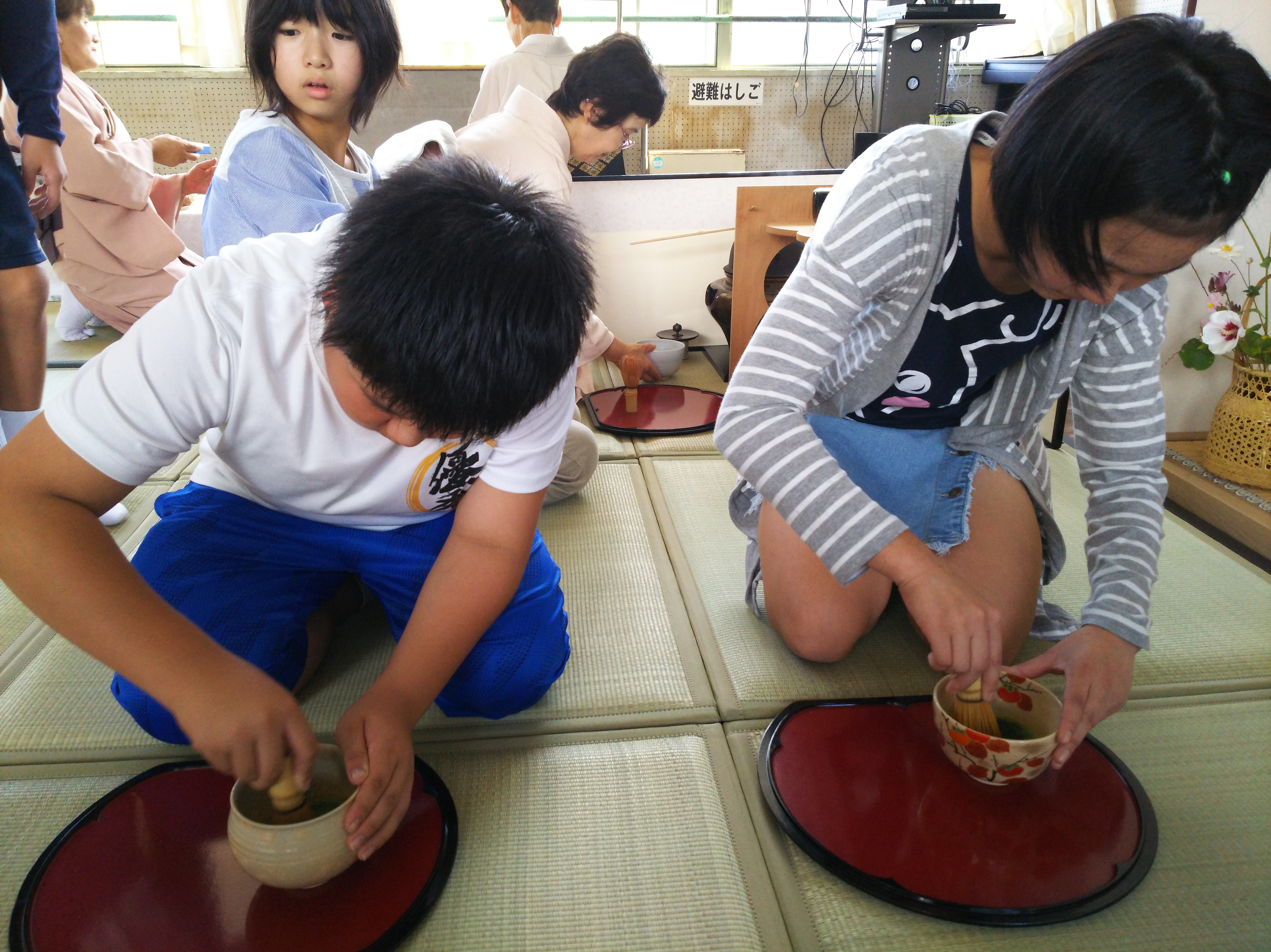 2018年10月9日 15時23分学校評議員の方や地域の茶道家の方においでいただき、茶道教室を開きました。5・6年生が参加しました。まずは作法通りに一服頂戴しました。次に、茶を点てさせていただきました。みんな上手にできました。足がしびれているのは、ご愛敬ということでご勘弁ください。