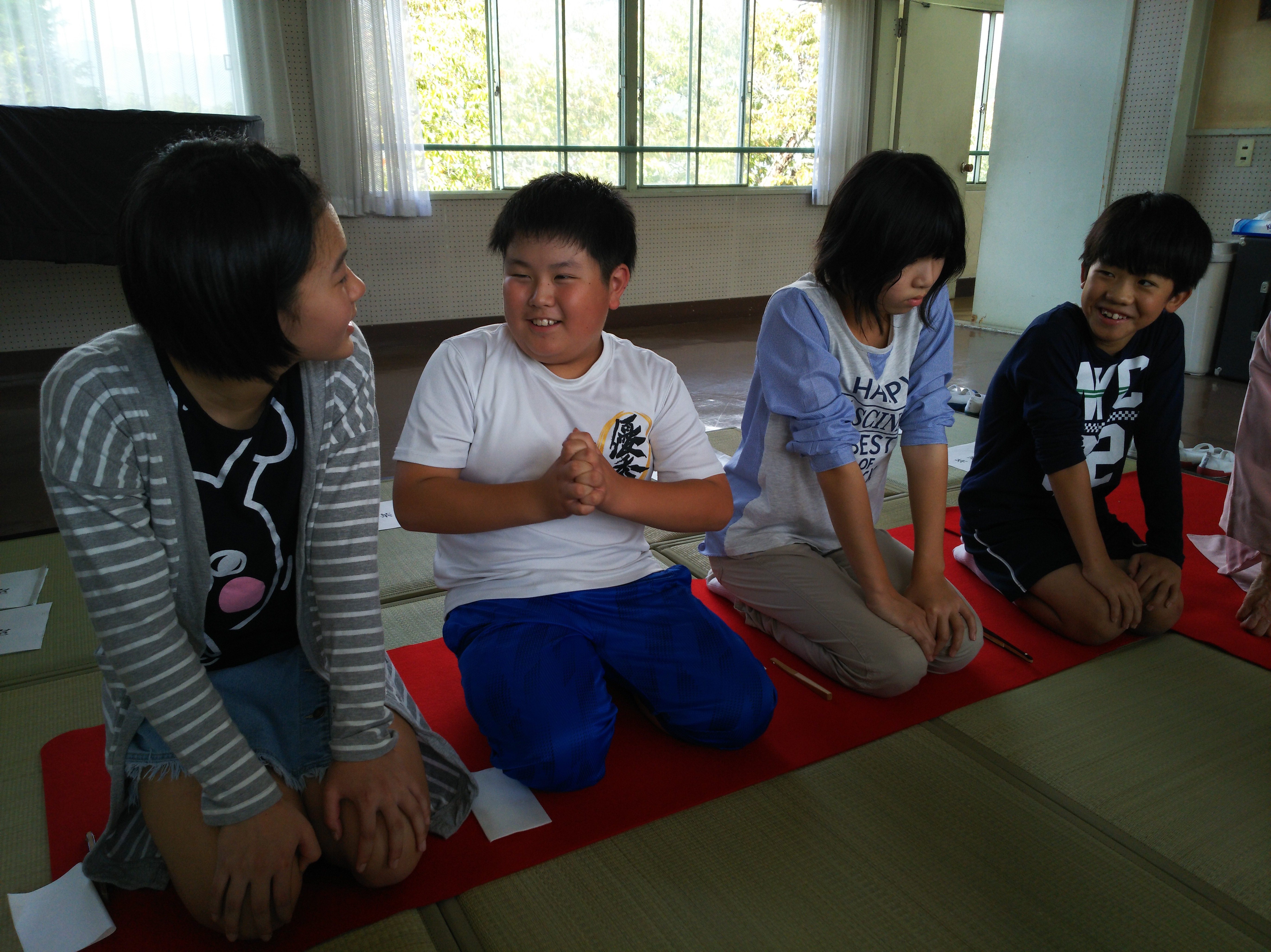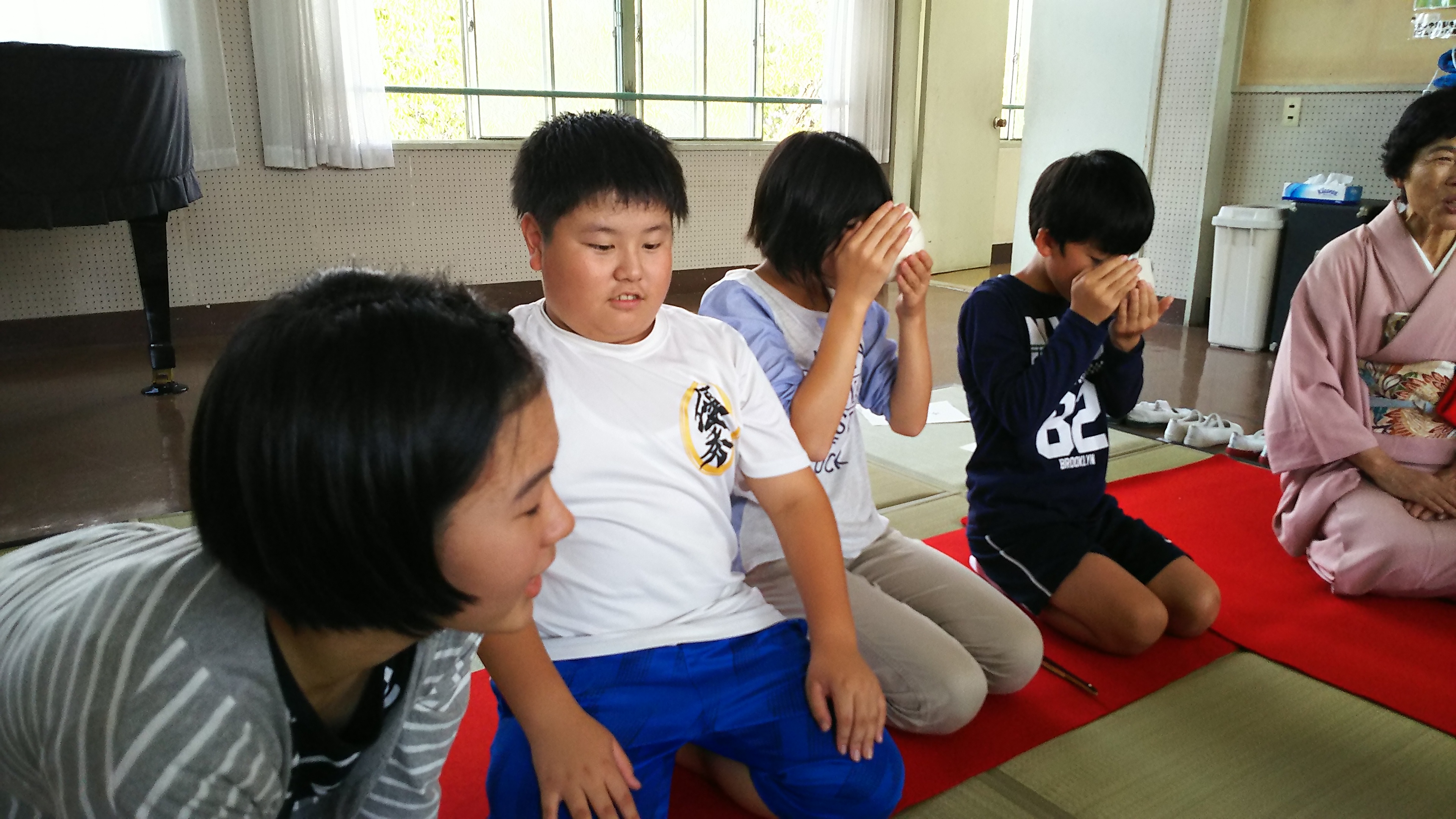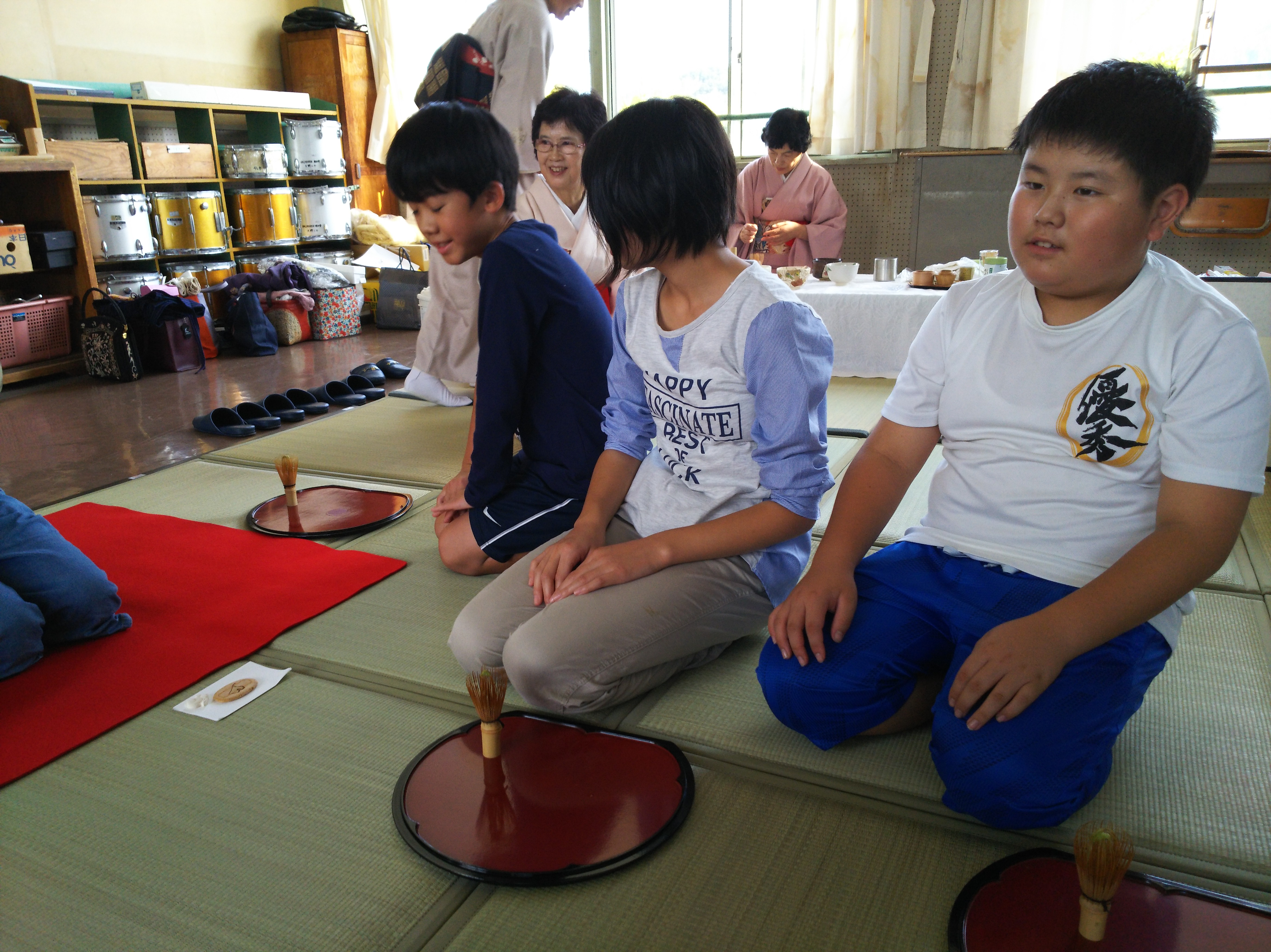 2018年10月9日 15時23分学校評議員の方や地域の茶道家の方においでいただき、茶道教室を開きました。5・6年生が参加しました。まずは作法通りに一服頂戴しました。次に、茶を点てさせていただきました。みんな上手にできました。足がしびれているのは、ご愛敬ということでご勘弁ください。
