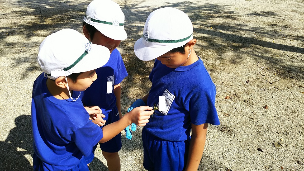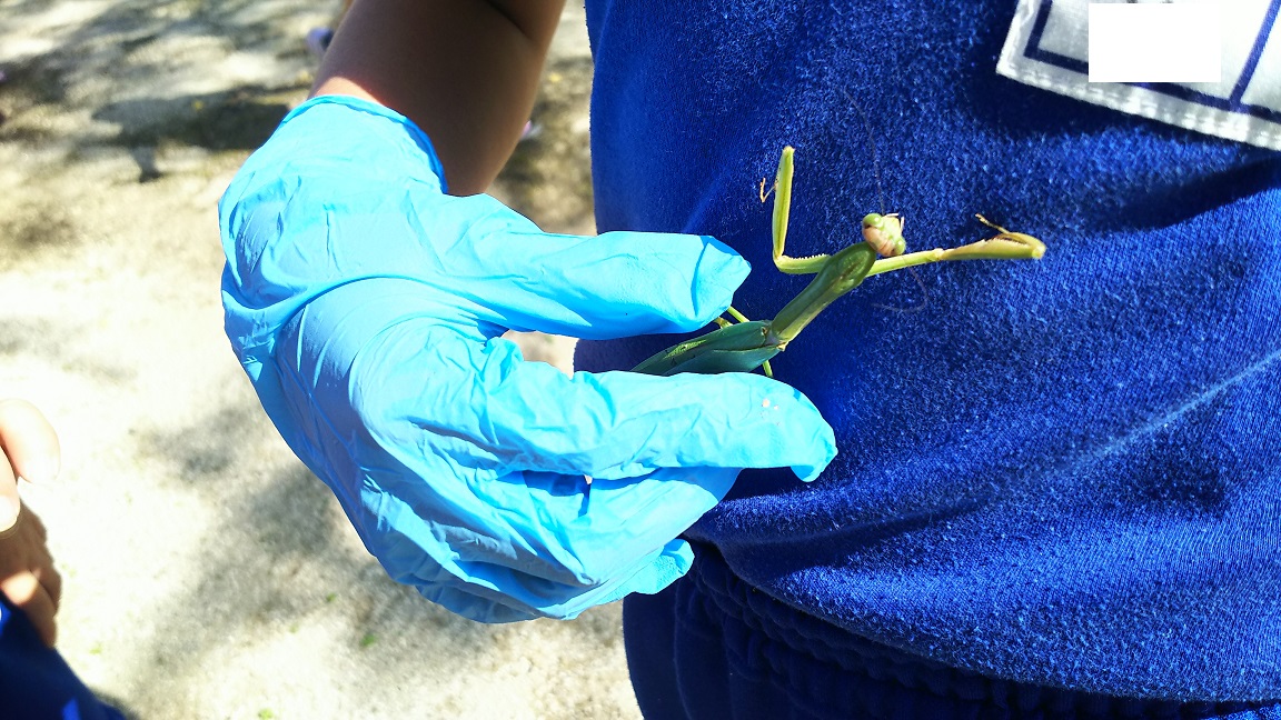 2018年10月10日 10時50分子どもたちのリスペクトは、自分の好きなものを見せたり、あげたりすること。今日はカマキリをいただいた先生がいました。とってもよく似合いますね。