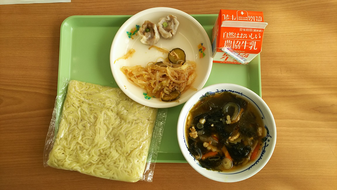 2018年10月10日 12時05分わかめラーメン、ポークシュウマイ、中華風煮びだしです。ラーメンのわかめが、とろとろになっていて、麺と絡んでなかなか美味でした。