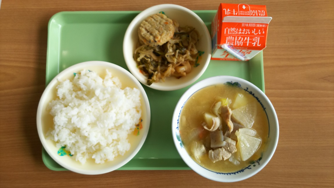2018年10月4日 12時06分ぶたじる、野菜入りの鶏つくね、昆布とちくわの煮びだし、です。とんじる、というのが習慣になっているため、ぶたじるに違和感を覚えてしまいます。