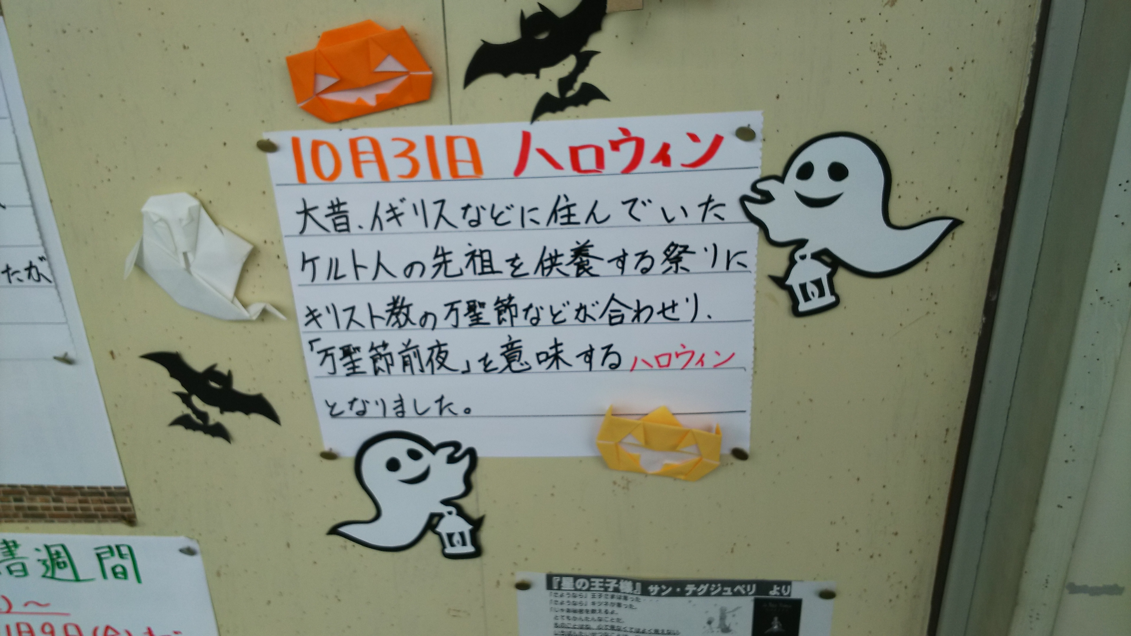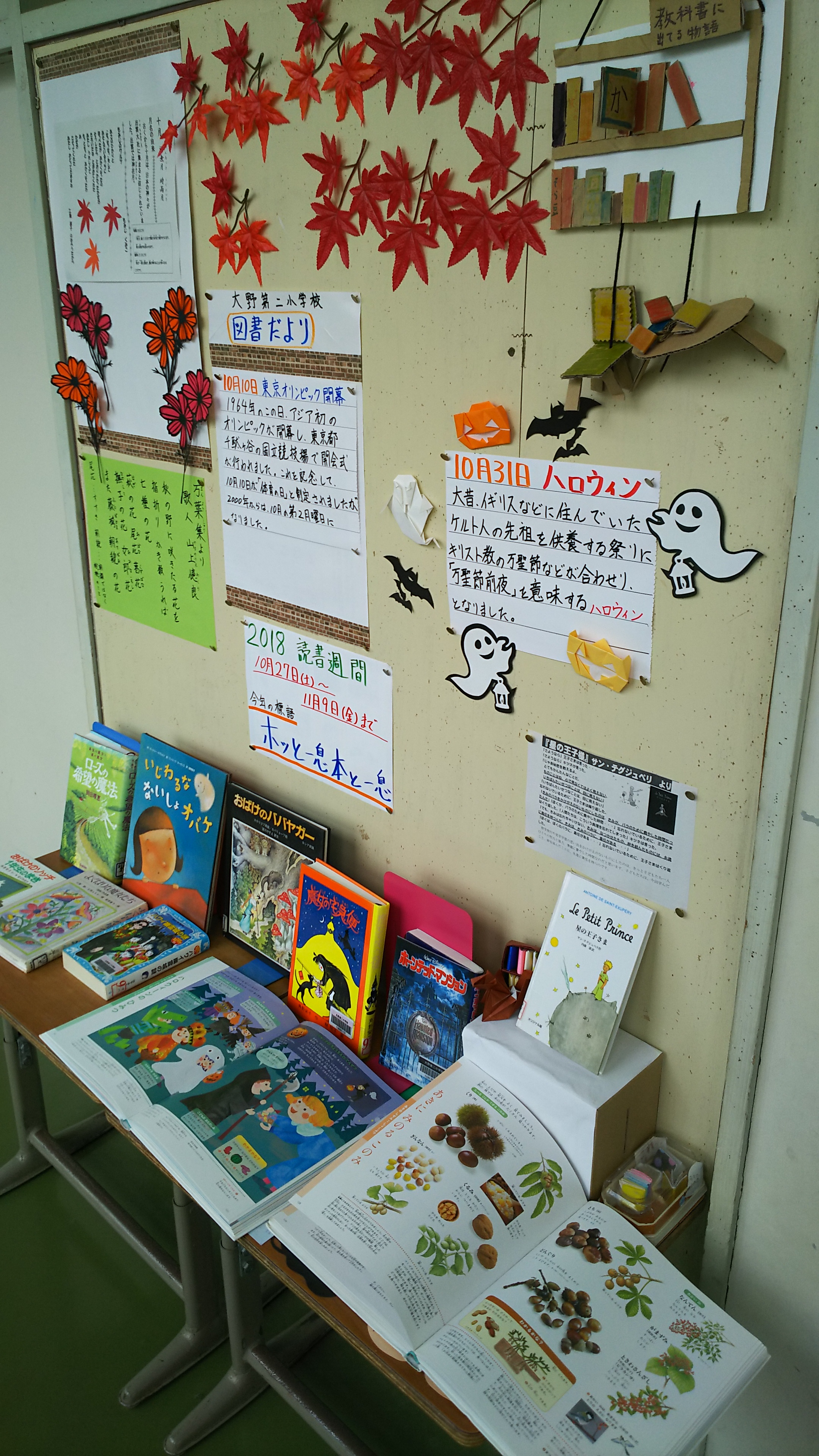 2018年10月4日 13時30分司書の先生が毎週キレイに飾り付けてくださっています。今週はハロウィン!かわいい(?)お化けたちが「トリック オア トリート」です。