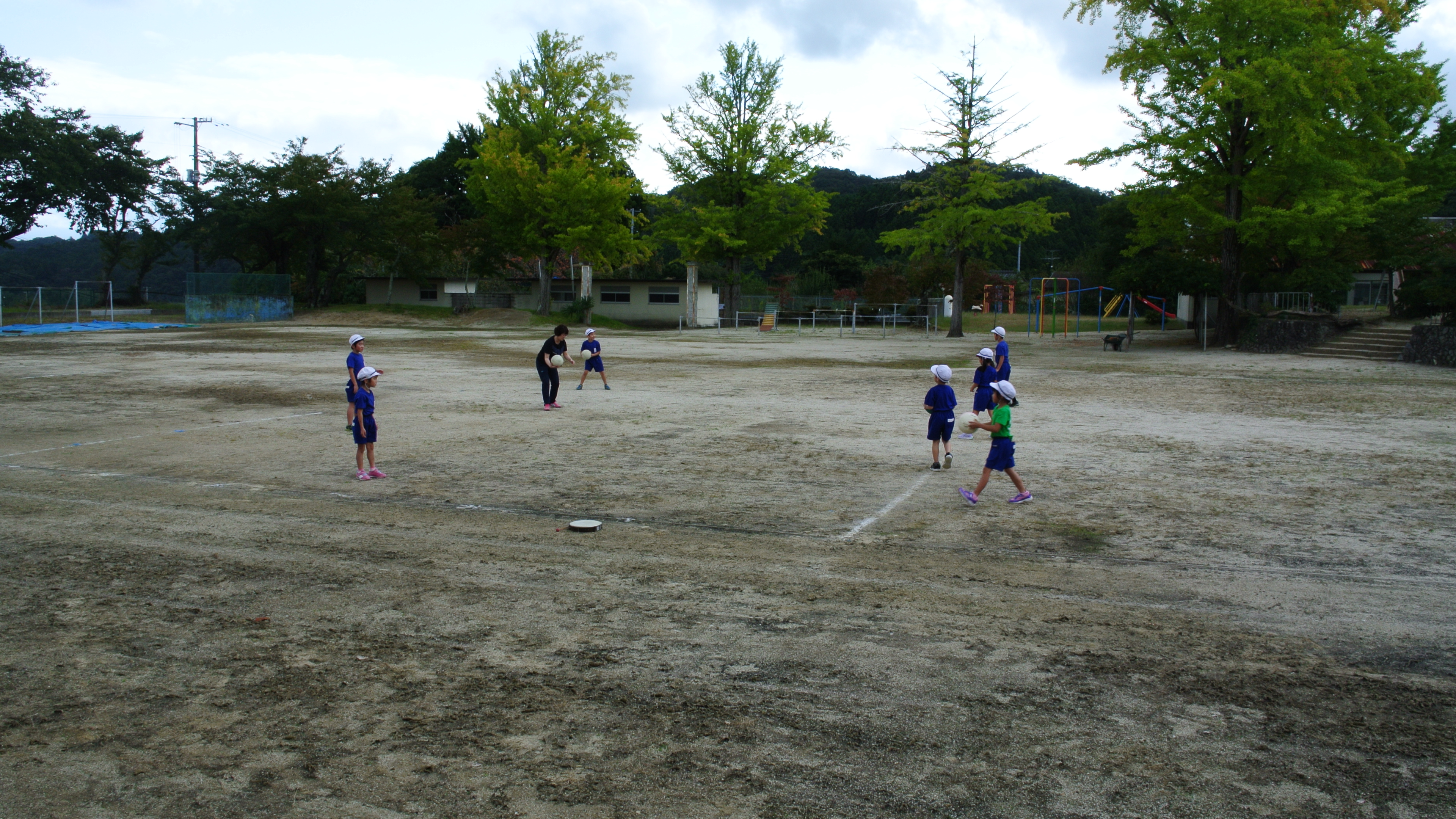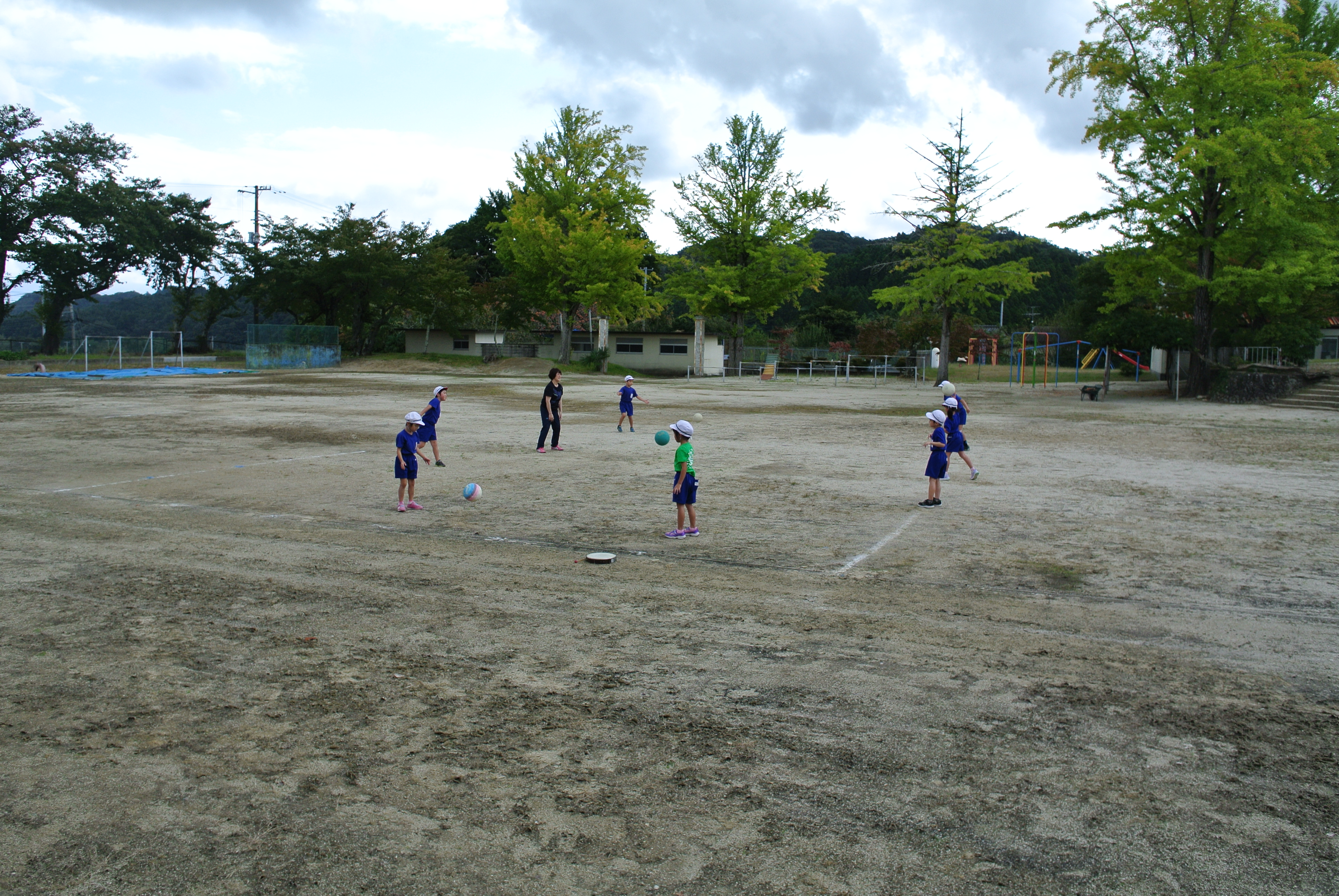 2018年10月9日 10時51分1・2年生が校庭で体育の授業。先生に聞かれます。ボールは何処に投げたら相手がとりやすいでしょうか?聞いていた校長は、真ん中だろう!と思ったのですが、答えは相手のそば。なぜかというと、1・2年生は投げる力が弱いから、バウンドしてとりやすいのは、相手のそばなのです。いや、勉強になりました。