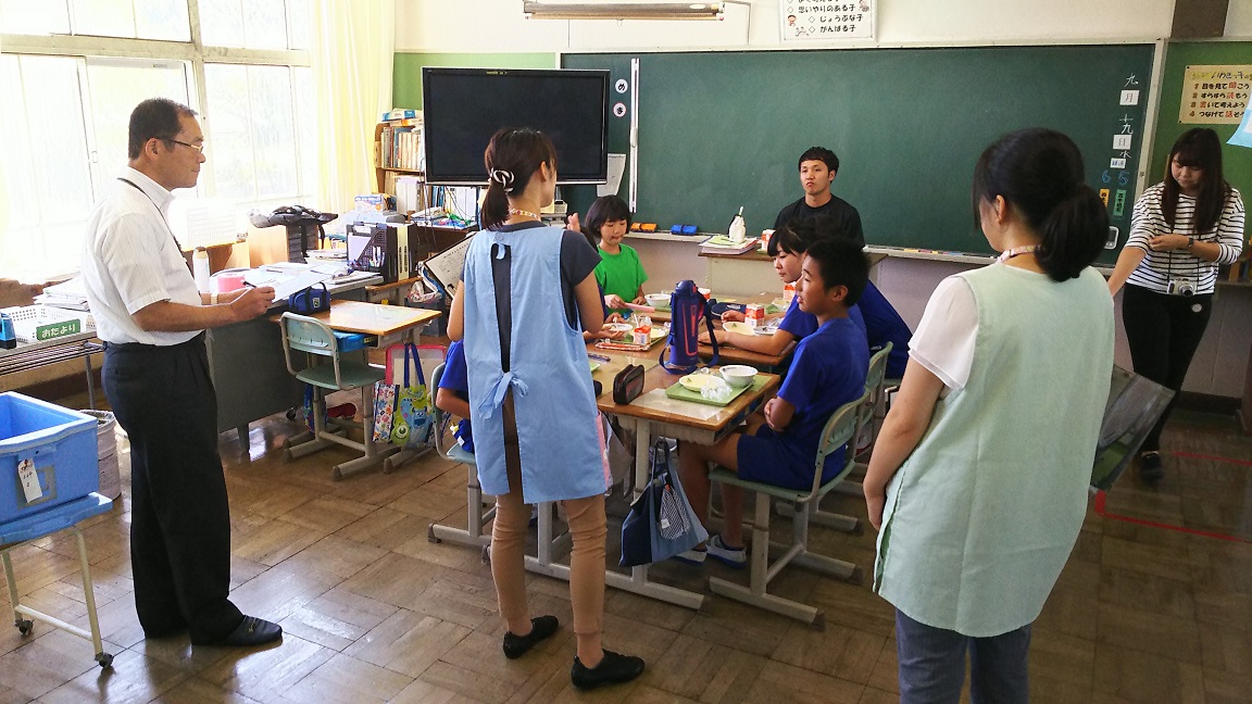 2018年9月19日 12時42分みなさんの給食の様子を見るために、給食センターから所長さんと栄養士さん、調理師さんが学校に来てお話をしてくださいました。子どもたちはもくもぐしながらも、ちゃんとお話を聞いていましたよ。