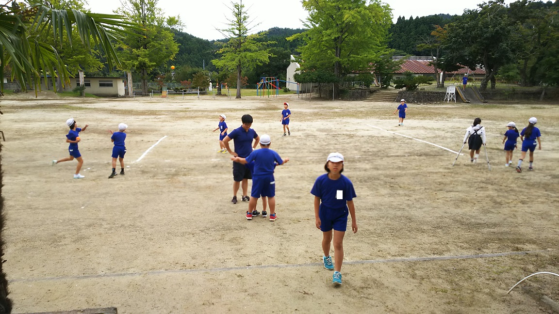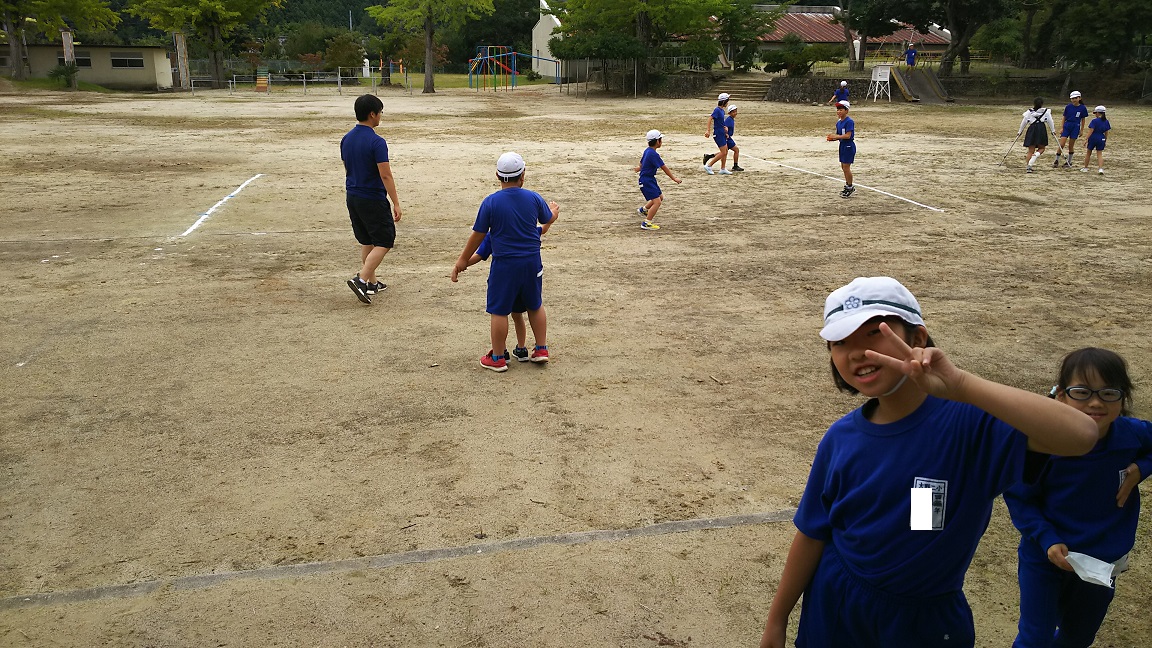 休み時間に校庭で一緒に遊びます。