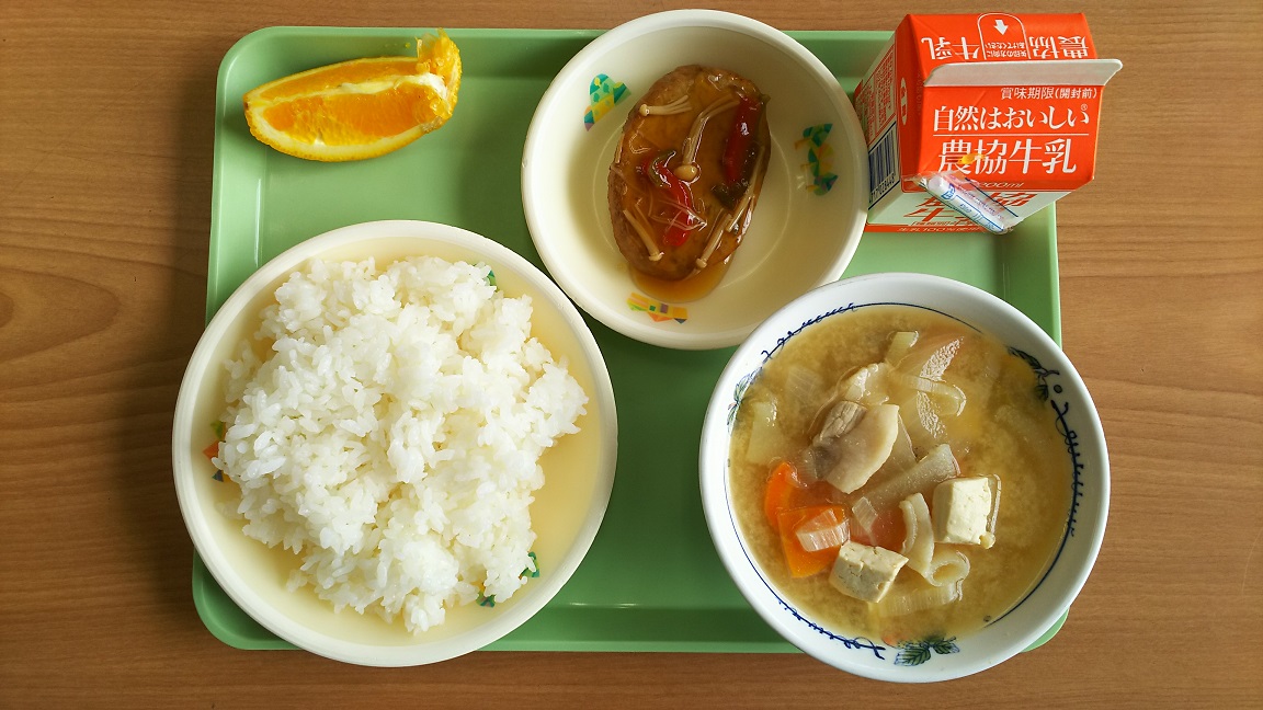 2018年9月20日 11時55分豆腐ハンバーグとオレンジです。豚汁のことを、「ぶたじる」とよぶ地域と「とんじる」とよぶ地域がありますが、いわき市は「ぶたじる」なのでしょうか?お宅はどうですか?
