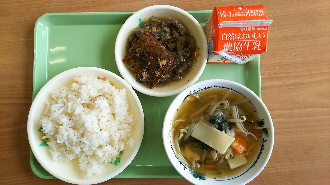 ぶたとナスの味噌いためは、暑くても食欲をそそる一品です。子どもたちに汗ふきを持たせてください、保護者の皆様!