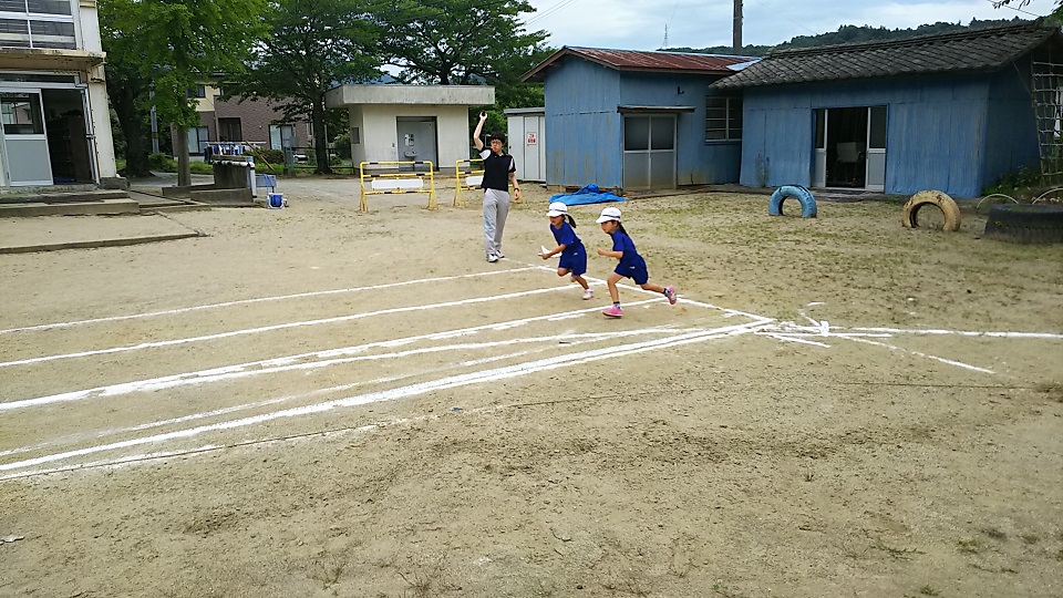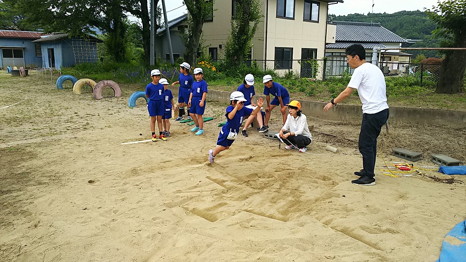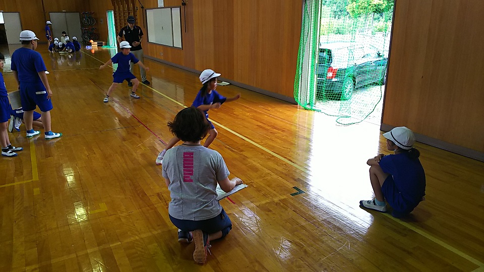 2018年6月27日 09時44分曇り空から時々雨の落ちてくる悪コンディションの中、子どもたちは元気よく体力テストに取り組んでいます。50m走に立ち幅跳び、ボール投げ。これから体育館でその他の種目を行います。1・2年生にとってはテストも遊び!もう、とても元気です。