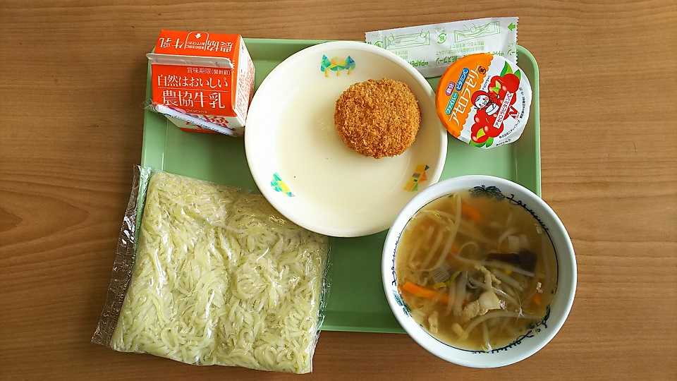 2018年6月27日 12時02分今日は塩ラーメンとキャベツメンチ、アセロラゼリー付きです。子どもたちはメンも大好きなので、残さず食べると思います。