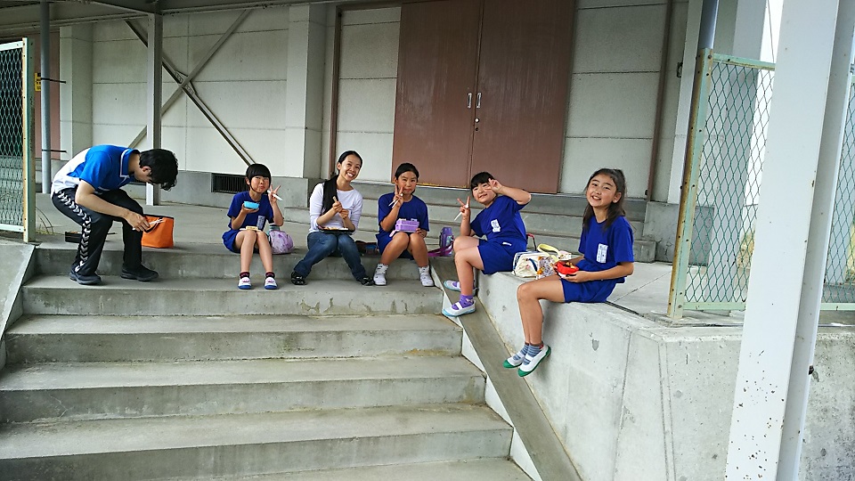 2018年6月28日 12時57分今日と明日は陸上大会の予備日であるためお弁当持参です。4年生はALTの先生と楽しくお弁当で会食。どこかの国の大統領のように、大切な話をしているに違いありません。