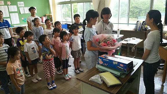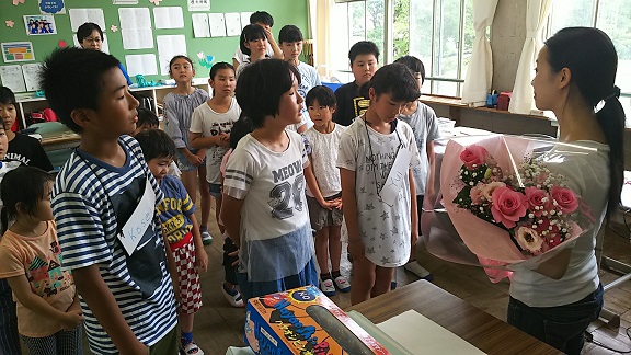 2018年6月28日 14時32分ALTの先生が、一学期を最後に帰国されるとのことです。この5年間、異国の地で英語を教えながら、日々どのような思いだったのでしょうか。本校児童は舞凛先生が大好き!7月12日に最後の授業があるのですが、その日に5年生と校長、養護教諭が「海の子山の子ふれあいツアー」で不在のため、今日、感謝の集いを行いました。舞凛先生、本当にお世話になりました。校長も英語を習いたかったです。