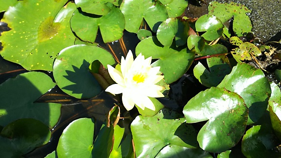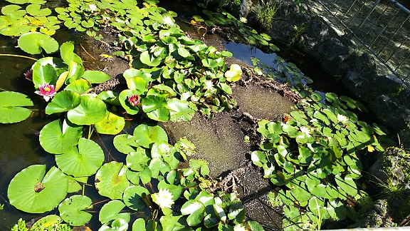 本校中庭の泥の中に咲くスイレンの花。葉の陰にはウシガエルもいます。のどかですね。