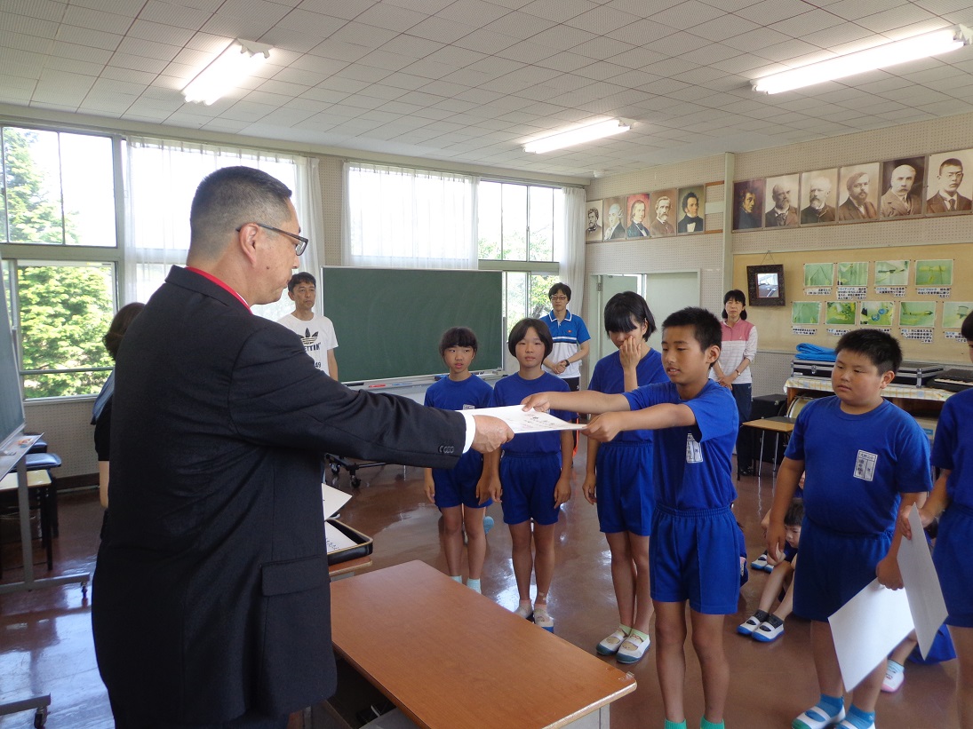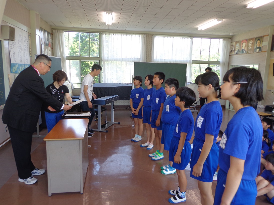 先週の陸上大会の賞状の伝達・全校生への披露を音楽室で行いました。実際に走った人はもちろん、補助の児童も応援の児童も、そして、学校で声援を送ってくれたみんなも、一緒になって獲得した賞状だと思います。みんなで頑張るって、すてきなことですね。